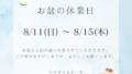 8/11~8/15は休業します。